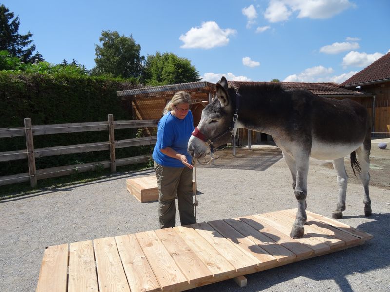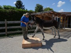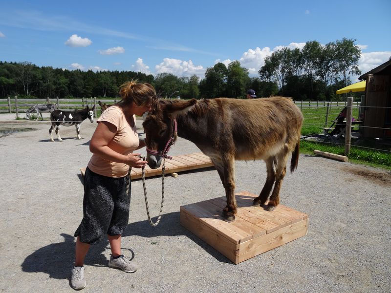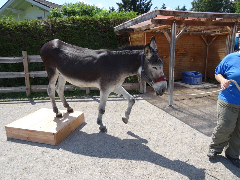 Das Podest wurde in Höhe und Größe so ausgeführt dass die kleineren Esel sogar mit allen 4 Hufen darauf stehen können und gefahrlos vor- oder rückwärts vom Podest wieder absteigen können. Als Option kann das Podest bei Bedarf mit einem Zusatz erhöht werden um den Schwierigkeitsgrad zu steigern.
